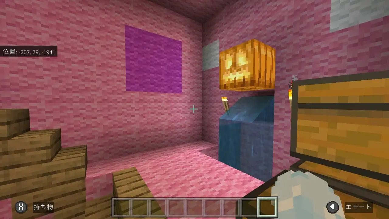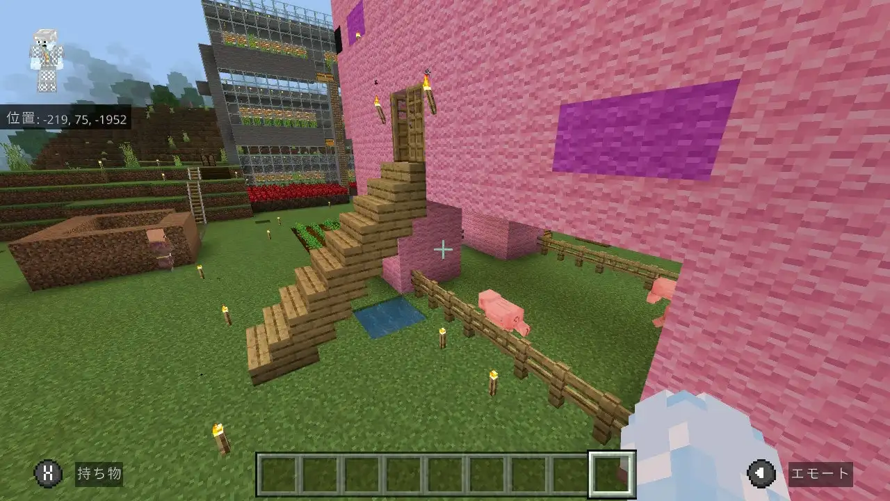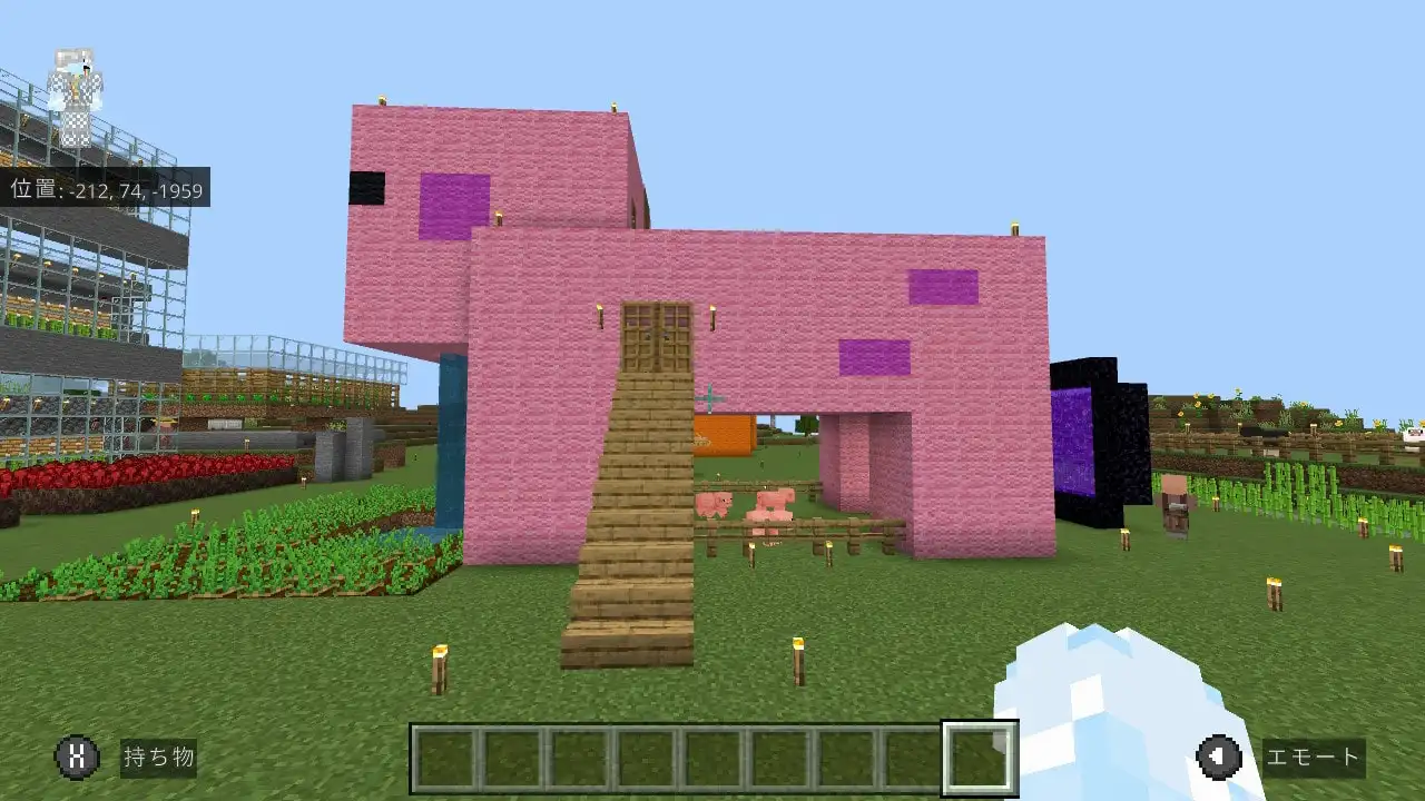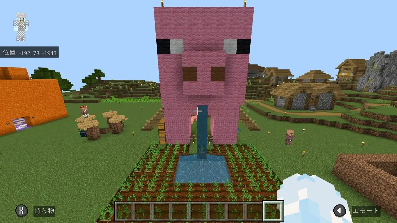 で、今回の記事の本題なのですが、組み立てて飾っているだけではもったいないので(?)、マインクラフトのゲーム内でも「レゴ(LEGO) マインクラフト ブタのおうち」を再現して作ってみようと思い実行しました。