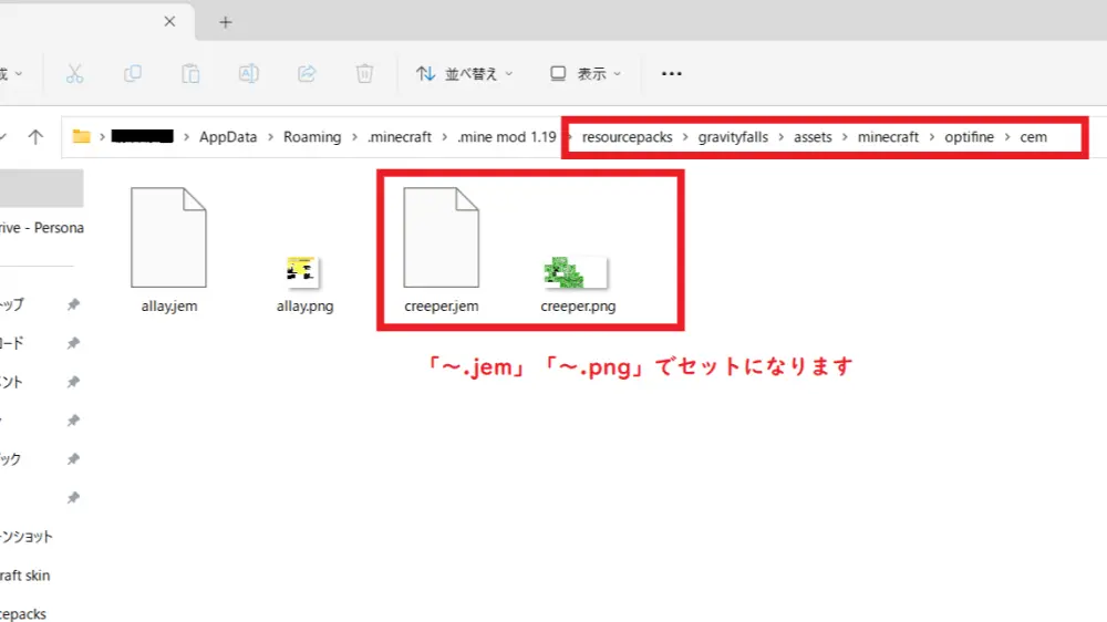 念のため、階層構造は「assets」→「minecraft」→「optifine」→「cem」→「~.jem」「~.png」となり、参考画像ももう一度載せます。