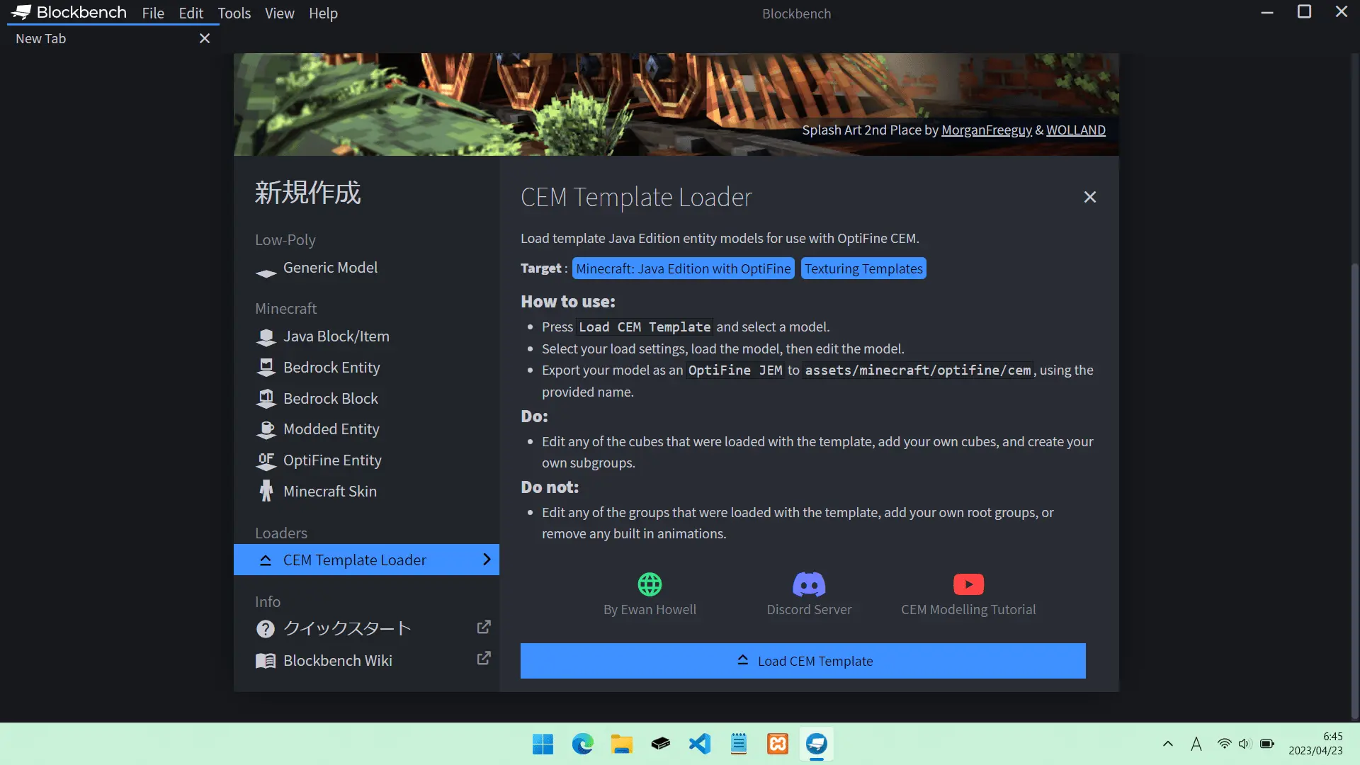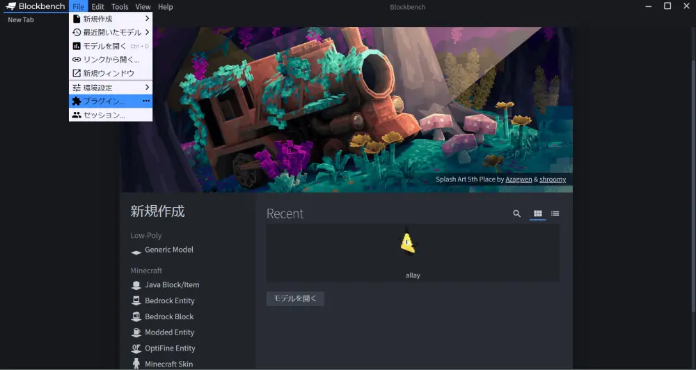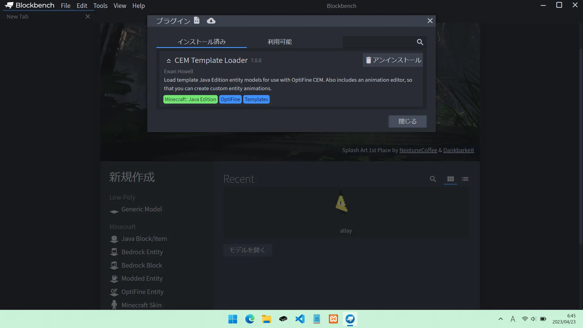 「Blockbench」を起動して、「Blockbench」内で「CEM Template Loader」をダウンロードします。