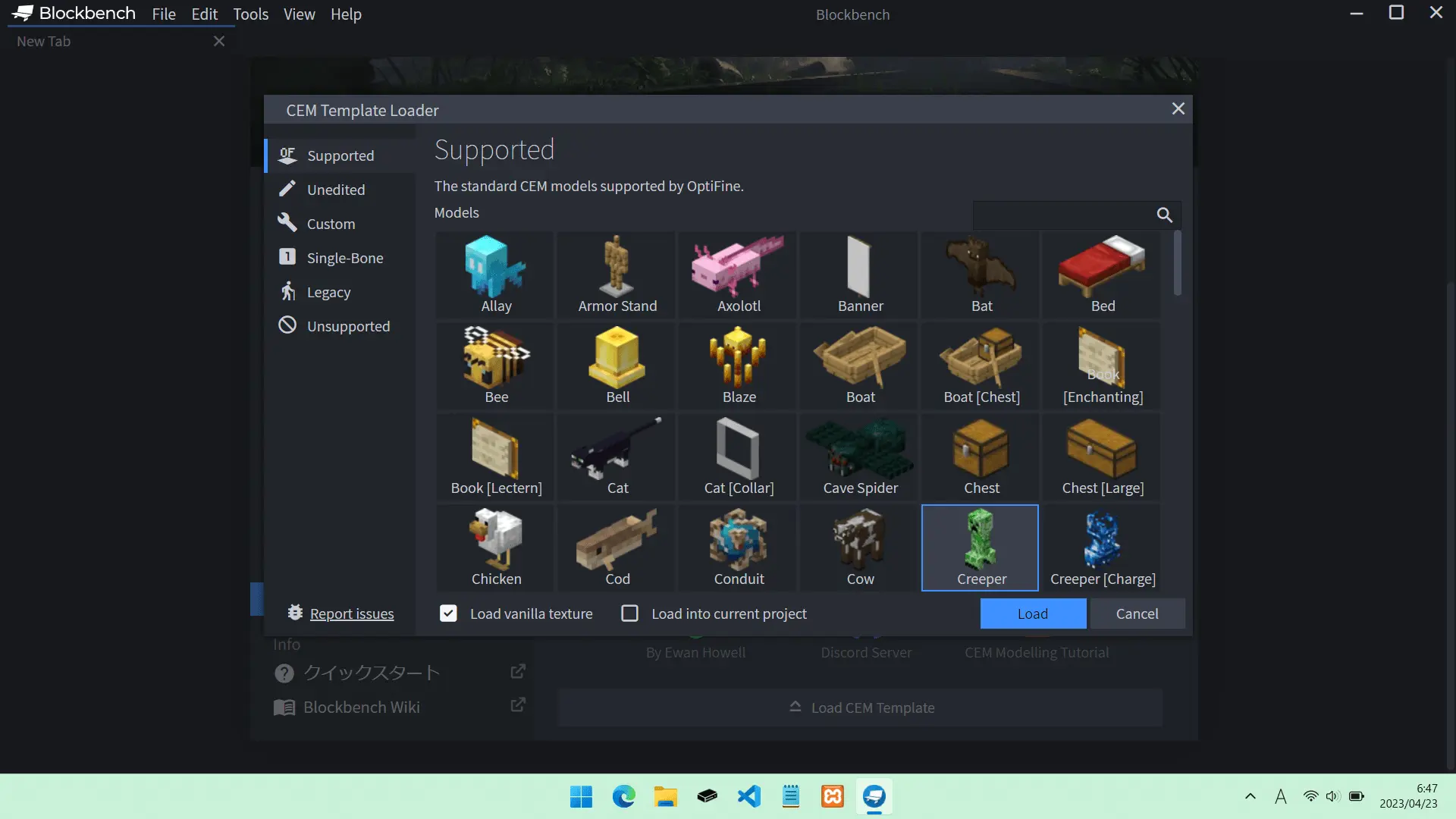 「Supported」内から変更したいモブを選ぶ → 「Load vanilla texture」にチェックを入れる → 「Load」をクリック