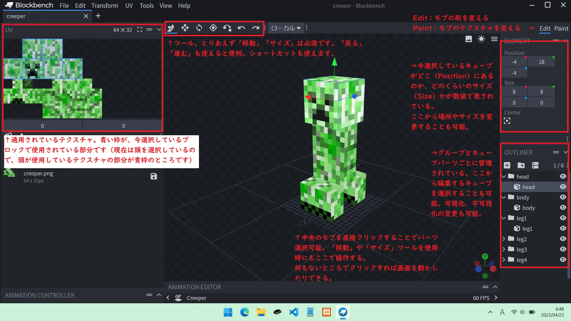 ※それぞれのモブは、そのモブに合わせてパーツごとに分かれています。クリーパーの場合はパーツが「head」「body」「leg1」「leg2」「leg3」「leg4」に分かれています。なぜ分かれているかというと、パーツごとに動きが設定されているからです。(「hrad」だけ動かして周囲を見渡す、歩行時は「leg」をバラバラに動かすなど)