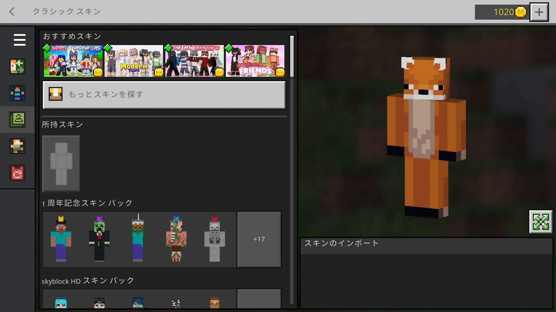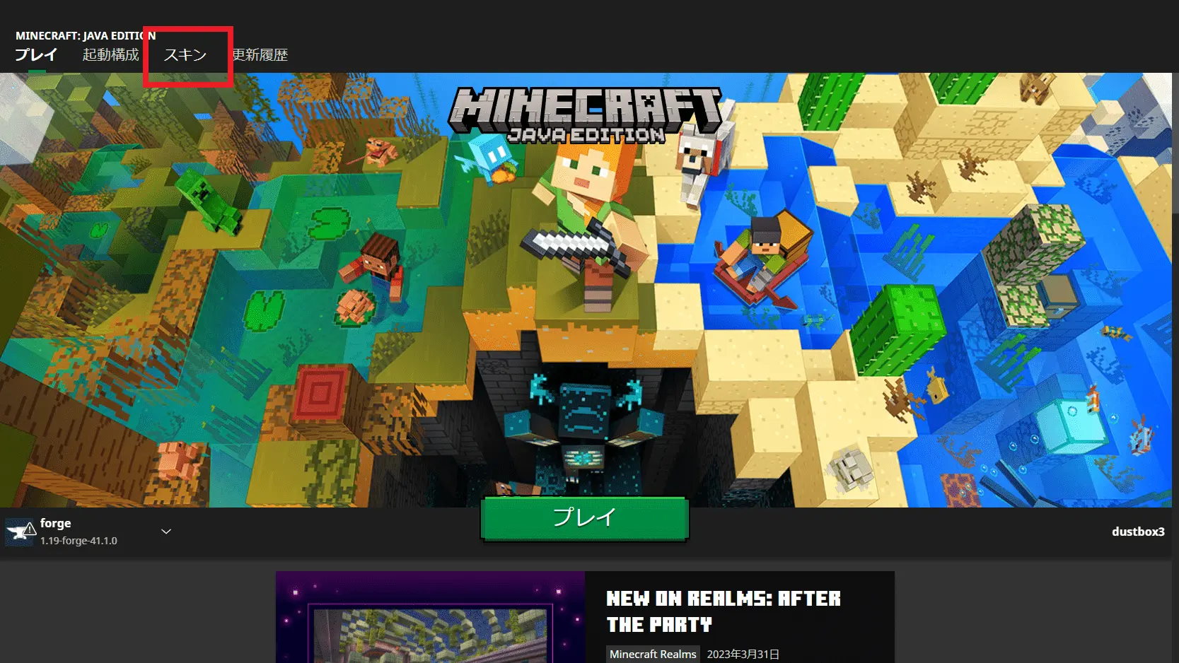 「Xboxコンソールコンパニオン」から「Mincraft Louncher」を開き、左上の項目から「スキン」をクリックします。