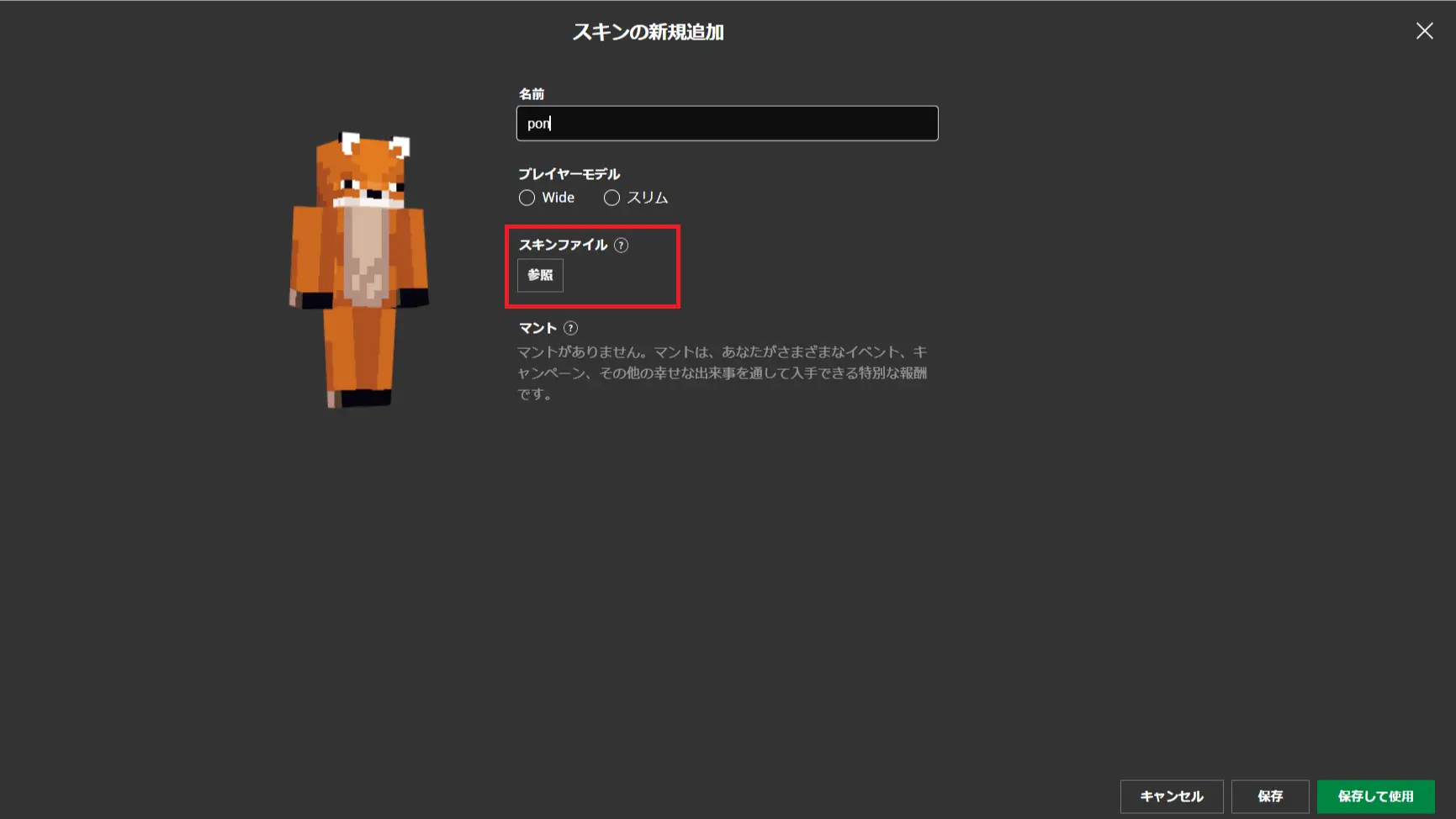 スキンの新規追加画面に移動するので、スキンの名前を「名前」に入力します。