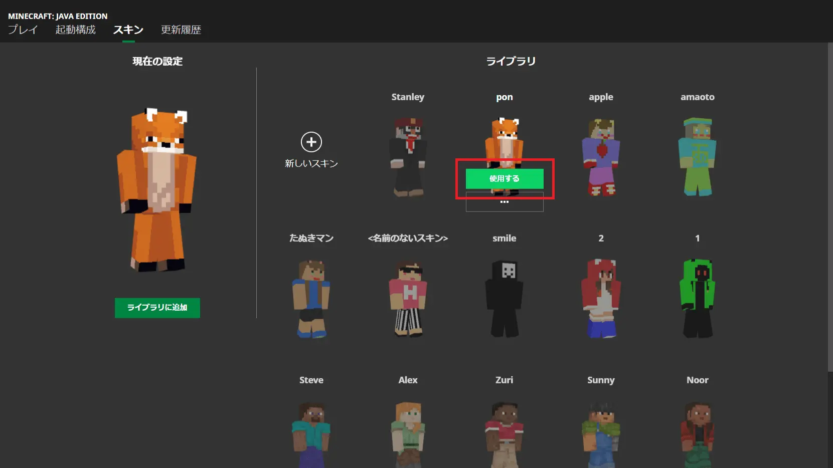 「保存」をクリックした場合は、使用する設定をします。スキンにカーソルを合わせると「使用する」が出てくるので、クリックするとスキンが選択されます。