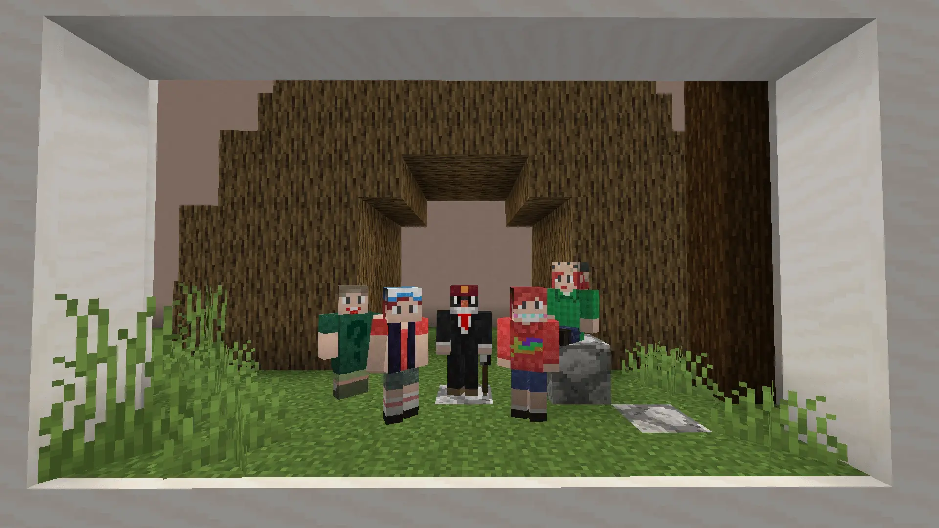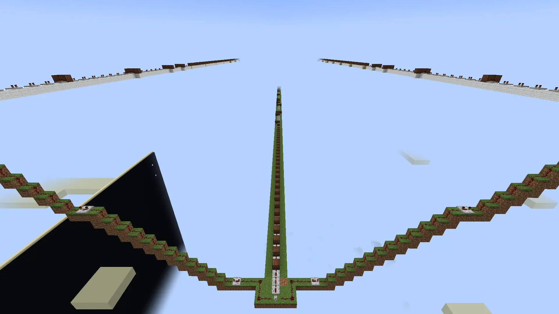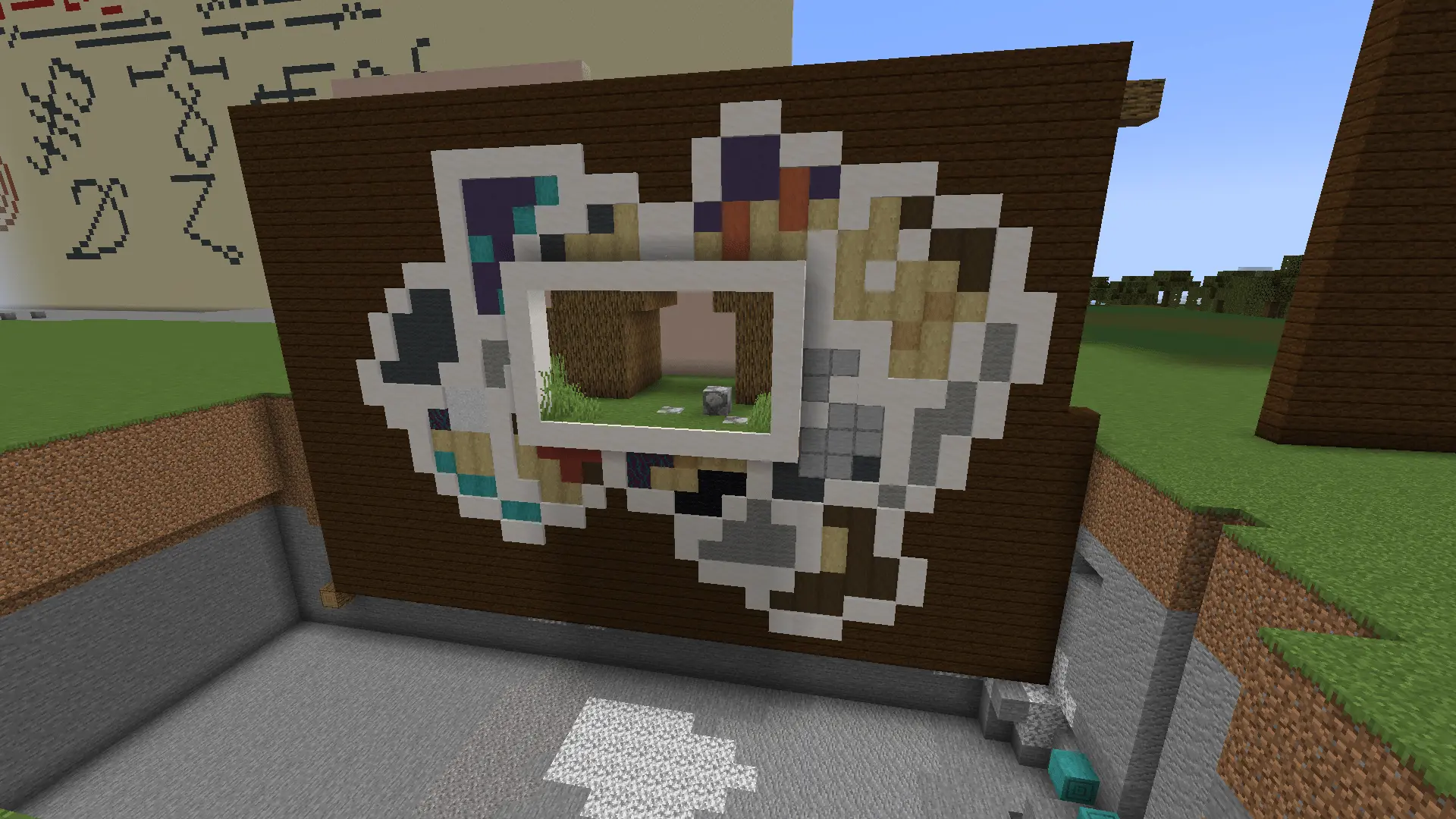 写真に見えるように縁取りをしたいので、作ったキャラクターのサイズや距離間、カメラの位置に合わせて行います。また、白色のブロックで縁取りをすると、内側の地面も白色になってしまう為、トラップドアのテクスチャを変更して写真の縁を作りました。