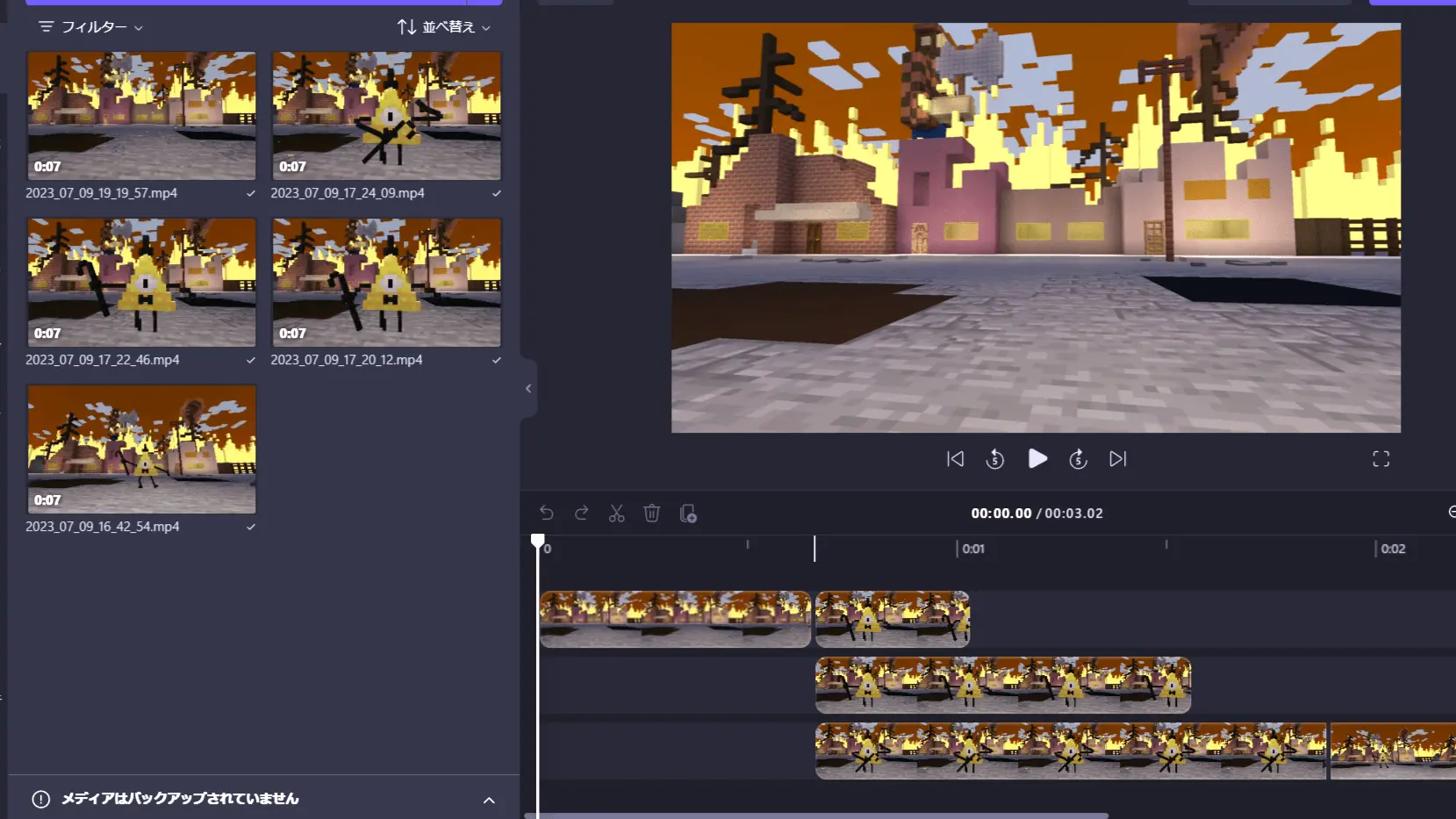 このようにして、姿が写っていないものも入れて同じ動画を5パターン用意して編集しました。