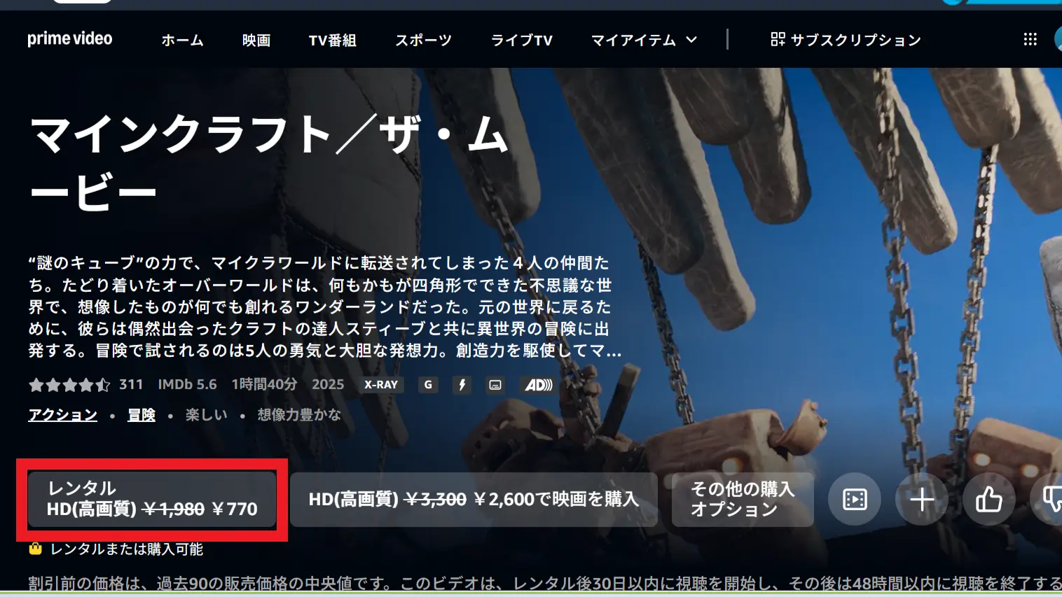 タイトルが全てで他に書くことも特にないのですが、「マインクラフト ザ・ムービー」のレンタルがAmazonプライムビデオで61%72%OFFになっていました。